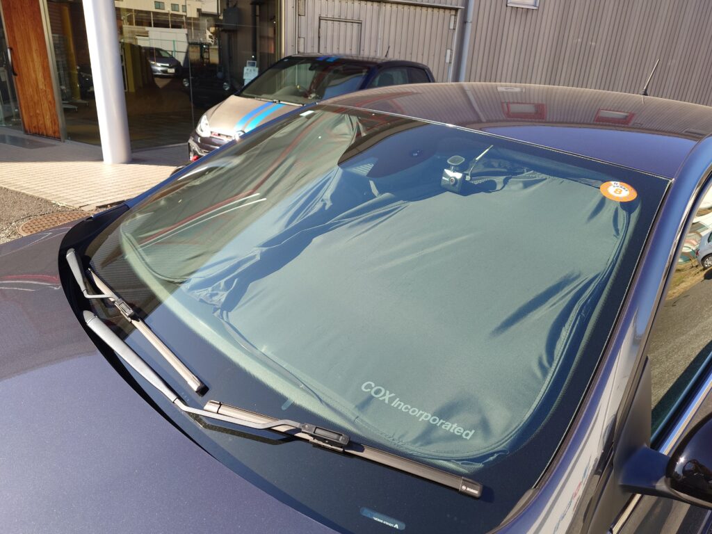 ■COXオリジナルフロントサンシェード【ブラック/グレーロゴ】【VW Golf4~8系/Tiguan(5N/AD/AX)/T-Cross/up!等 汎用タイプ】 ※適合追加