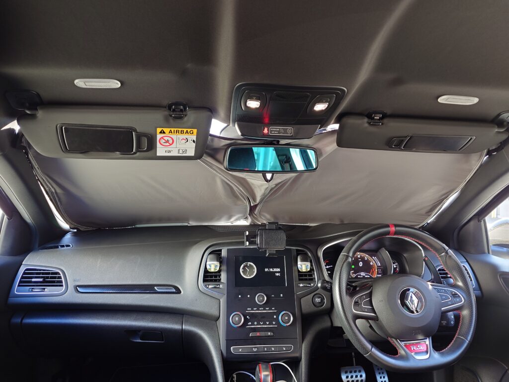 駐車時のダッシュボードやシート、ステアリングなどの車内部品の温度上昇を抑える他、プライバシー保護に役立つ本製品は、外側に小さめのロゴとブラック生地の採用により装着感を抑えて設置中(不在中)の車両への注目を集めにくくし、車内側に明るめのシルバー生地を採用することで在車中の使用でも圧迫感を抑えた仕様としています。(シルバー側を表面として使用することも可能です)